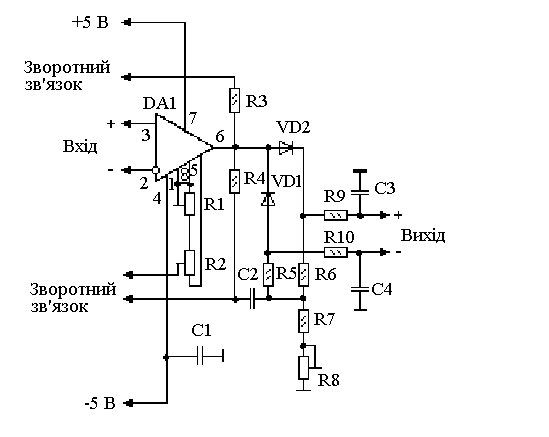 На резисторах R7 і R8 виділяються обидві півхвилі підсилюваної напруги. З них напруга зворотного зв'язку по змінному струму подається через конденсатор С2 на інвертуючий вхід підсилювача, чим досягається висока точність і лінійність перетворення. Стабільність робочої точки підсилювача за постійним струмом забезпечується за рахунок зворотного зв'язку через резистор R4. Відносно великий опір цього резистора вибраний тому, що він не повинен шунтувати вимірювальний ланцюг VD1, VD2, R5, R6. Ємність конденсатора С2 також вибрана порівняно великою, оскільки він утворює з паразитною ємністю монтажу дільник вхідного сигналу, що поступає на інвертуючий вхід підсилювача.