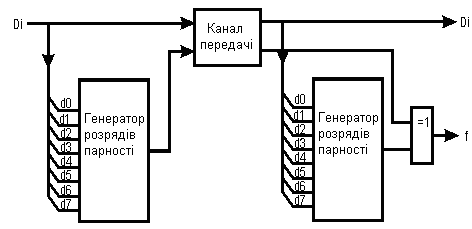 Блок-схема для захисту даних за допомогою перевірки на парність представлена на рис. 5.1. Порівняння переданого контрольного розряду з обчисленим на приймальній стороні відбувається за допомогою елемента ВИКЛЮЧНЕ АБО. Якщо вони розрізняються, то сигнал помилки f = 1.
