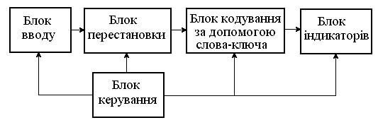 Для наочного розуміння принципів криптографічного захисту інформації була створена лабораторна установка. Вказаний пристрій "Шифратор" призначений для моделювання апаратного шифрування двійкової інформації. В установці використовуються наступні способи шифрування: перестановка окремих бітів з одного двійкового числа в інше за певним законом; використовування слова-ключа. Структурна схема пристрою представлена на рис.6.4.