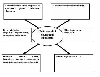Соціальні проблеми молоді – це не будь-які суперечності її життєдіяльності, а лише такі, що поглиблюються і свідчать про недостатність існуючих способів їх вирішення, а отже призводять до появи дезорганізуючих процесів у системі „суспільство - молодь”.