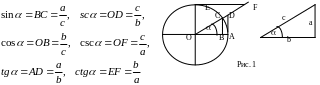Тригонометрические функции угла определяются с помощью тригонометрического круга радиуса r=1, а также из прямоугольного треугольника (для острых углов) (рис. 1).