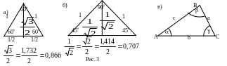 На рисунке 3 показано, как из свойств равностороннего треугольника (рис 3а) и равнобедренного прямоугольного треугольника (рис. 3б) с помощью теоремы Пифагора получить значения тригонометрических функций для углов 0º, 30º, 45º, 60º, 90º.