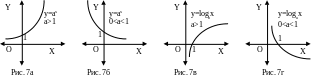 Показательная функция: у=ах определена для всех х и положительна. При а>1 она монотонно возрастает, при 0<a<1 монотонно убывает (рис 7а,б). Для любого а у(0)=а0=1