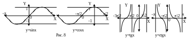 Функции y=sinx, y=cosx определены при всех значениях х, функция y=tgx определена на всей числовой оси, кроме точек: x=(2k+1)/2, (k=0, 1, 2,…), функция y=ctgx определена на всей числовой оси, кроме точек: x=k (k=0, 1, 2,…) (рис. 8)