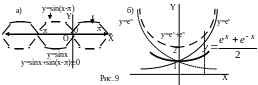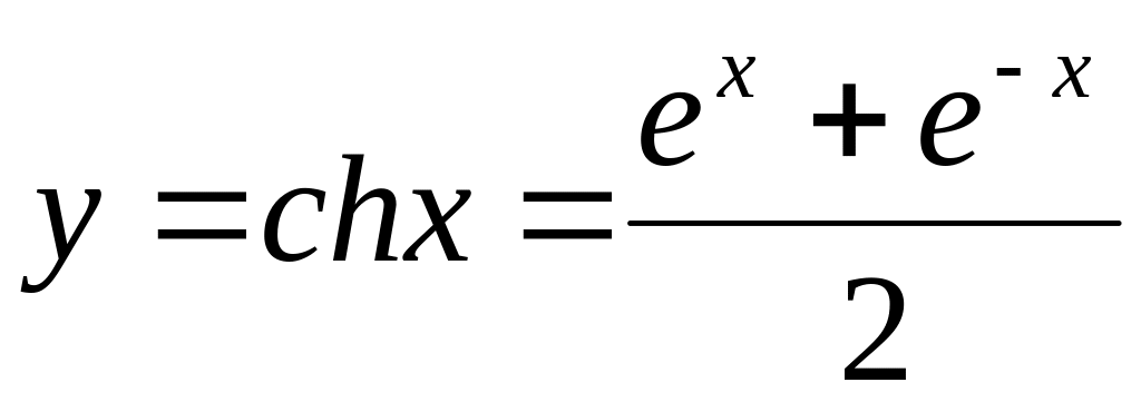 На рисунке 9б показан метод построения графика гиперболического косинуса из графиков функций ех и е-х, жирной чертой показан готовый график. За его форму его еще называют цепной линией. Форму цепной линии принимает гибкая тяжелая нерастяжимая нить, подвешенная в двух точках. Гирлянды, так часто употребляемые в бордюрах, должны иметь форму цепной линии. Цепная линия – четная функция, пересекает ось OY в точке у=1, симметрична относительно оси OY. Она очень похожа на параболу и только в XVIII веке Якоб Бернулли доказал, что форму свободно провисающей цепочки описывает цепная линия, а не парабола.