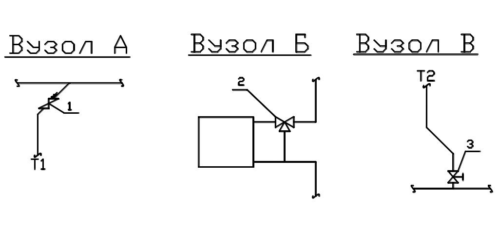 Рис. 11. Схеми вузлів «А», «Б», «В» вертикальної однотрубної системи водяного опалення (до рис. 12)