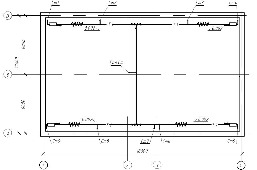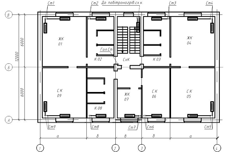 На планах і перетинах поверхів, підвалу і горища (рис. 8...10) вказуємо в умовних позначеннях опалювальні прилади, стояки, магістральні теплопроводи, трубопроводи введення теплових мереж в тепловий пункт і трубопроводи введення системи опалення в тепловий пункт (схема теплового пункту зображена на рис. 7).