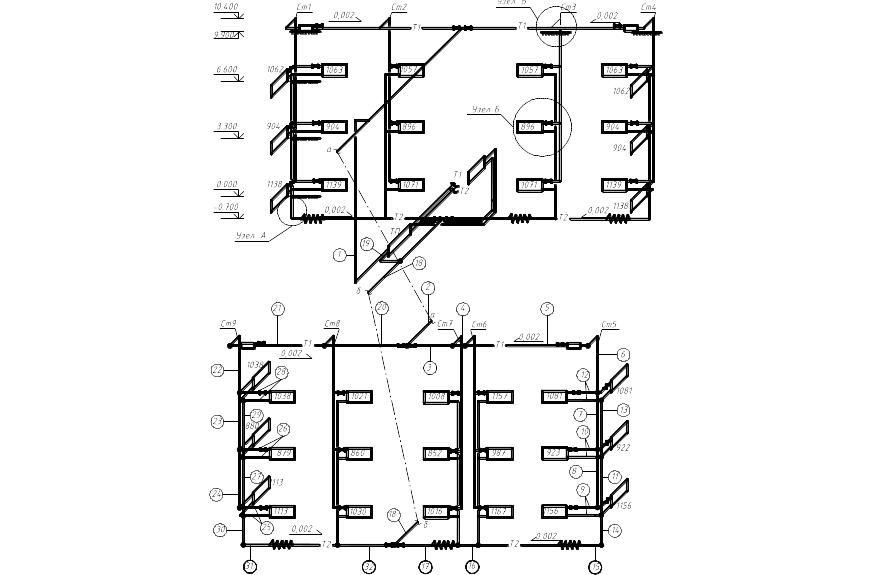 На підставі вказаних вище креслень виконуємо аксонометричну схему системи опалення (рис. 12) і розробляємо вузли (рис. 11). На схемі системи опалення розподіляємо теплові навантаження приміщень по опалювальним приладам у вигляді навантаження опалювального приладу, підсумовуємо по стояках і вказуємо на схемі.