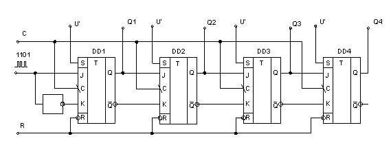 Допустим, что в регистр последовательно вводится начиная с младшего разряда двоичный код 1101, который поступает с внешнего устройства синхронно с тактовыми импульсами. С первым тактовым импульсом в триггер DD1 записывается «1» младшего разряда. Со следующим тактовым импульсом эта «1» будет сдвинута в триггер DD2 и окажется на его выходе. Одновременно в 1-ый триггер запишется «0». После 4-х тактовых импульсов параллельный код на выходах Q1—Q4 будет соответствовать последовательному входному. После пятого тактового импульса сигнал, бывший на выходе Q4 выводится из регистра и пропадает. После 8 тактов регистр полностью очищен.