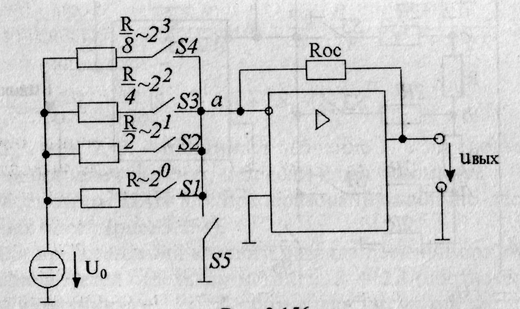 Из анализа схемы следует, что модуль выходного напряжения пропорционален числу, двоичный код которого определяется состоянием ключей S1...S4. Токи ключей суммируются в точке «а», причем токи различных ключей различны (имеют разный «вес»). Это и определяет название схемы.