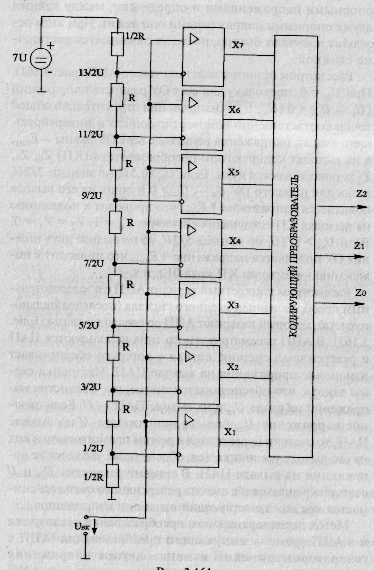 Рассмотрим принцип действия такого АЦП. При Uвх = 0, поскольку для всех ОУ разность напряжений (U+ - U-)< 0, напряжения на выходе всех ОУ равны - Епит, а на выходах кодирующего преобразователя (КП) Z0, Z„ Z2 устанавливаются нули. Если UВX>0,5 U, но меньше 3/2 U, лишь для нижнего ОУ U+ - U_ > 0 и лишь на его выходе появляется напряжение +ЕПШ, что приводит к появлению на выходах КП следующих сигналов: Z0 = 1, Z2 = Z, = 0. Если UBX > 3/2 U, но меньше 5/2 i/, то на выходе двух нижних ОУ появляется напряжение +Епит, что приводит к появлению на выходах КП кода 010, и т. д.