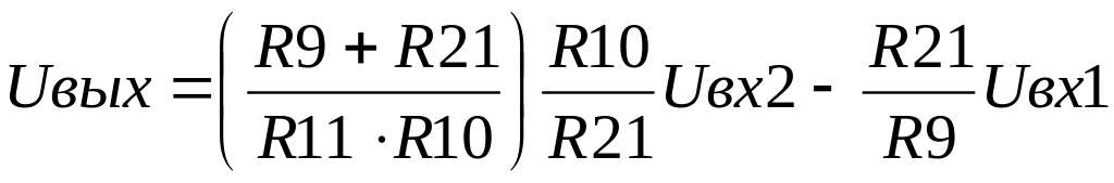 Для схемы, представленной на рисунке, выходное напряжение пропорционально разности напряжений на входах Uвх1 и Uвх2.
