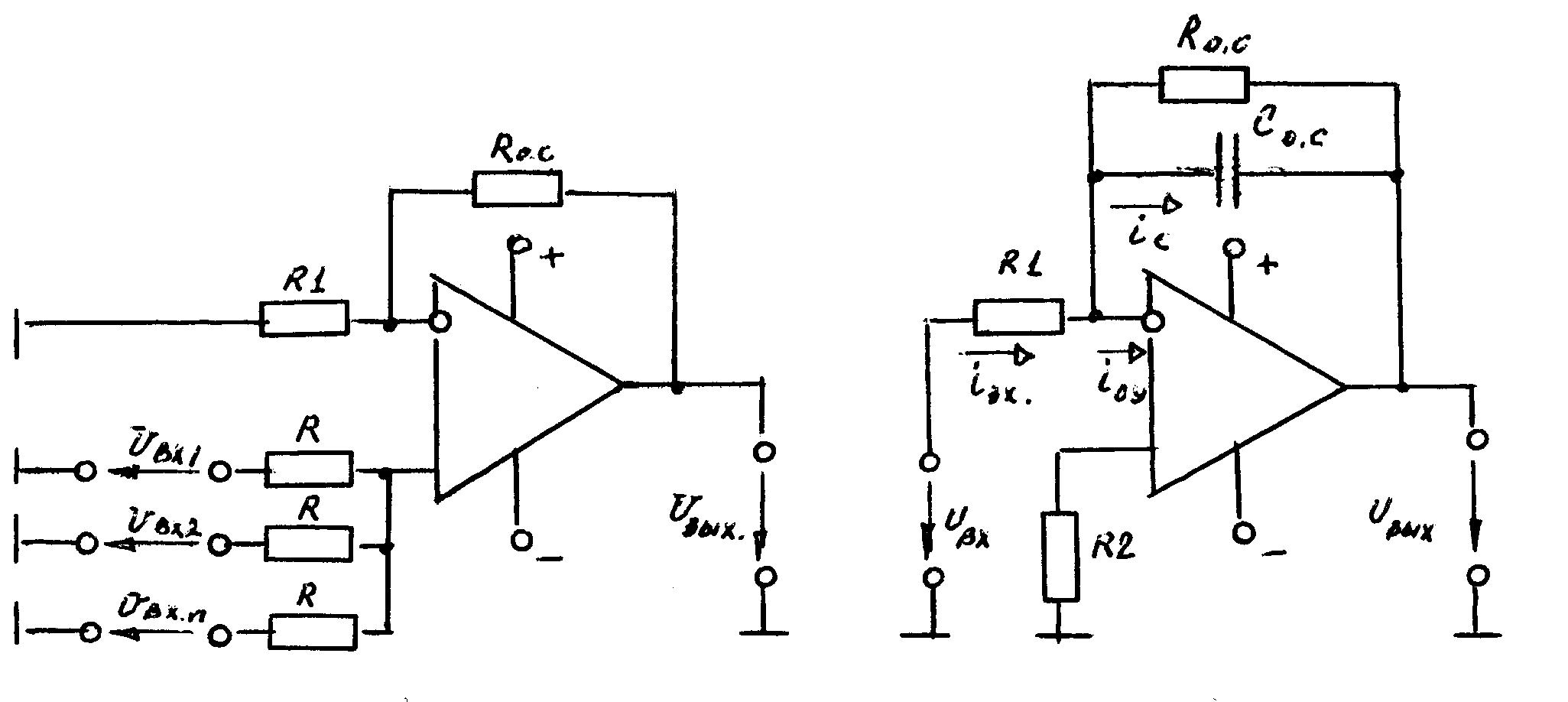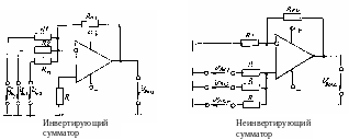В схеме сумматоров переменным параметром является сопротивление обратной связи Rо.с, которое и определяет коэффициент усиления. Формулы приведены для постоянных величин (числовой сумматор) Uвх.1, Uвх.2 и т.д.