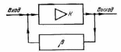 На рисунке приведена структурная схема усилителя с коэффициентом усиления К, охваченного внешней цепью ОС с коэффициентом передачи β. Цепь вместе с усилителем, к которому она подключена, образует замкнутый контур, называемый петлей ОС. Стрелками показаны направления прохождения сигнала.
