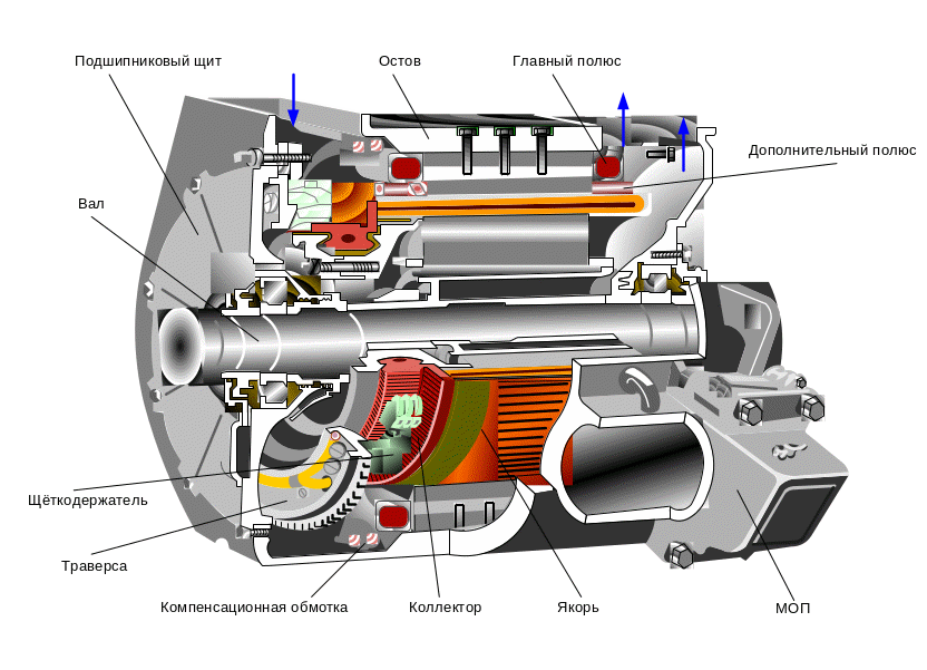 Электродвигатель НБ-418К6 (рис. 28) состоит из двух основных частей: неподвижного остова и вращающего якоря. Остов машины является магнитопроводом. На нём расположены главные и дополнительные полюса, подшипниковые щиты и щёточный аппарат. Якорь имеет сердечник, коллектор и обмотку, по которой протекает ток якоря.