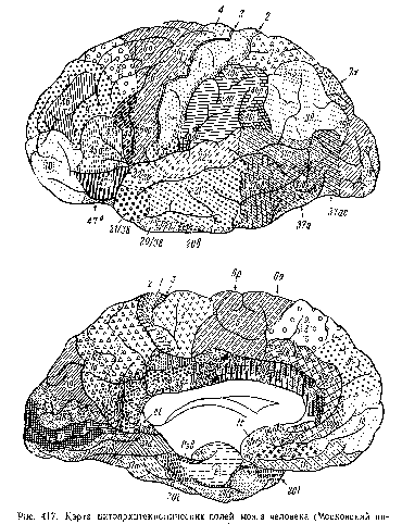 На основании морфофункциональных отличий различных областей коры головного мозга была создана цитоархитектоническая карта коры полушарий, в которой выделены различные корковые поля. На карте в коре больших полушарий человека выделено 11 областей, включающих 52 поля. Рассмотрим некоторые из них.