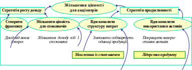Розробку стратегічної карти здійснюють «зверху вниз». Розпочинають із формулювання фінансових цілей та визначення маршрутів, що приведуть до їх досягнення. Тобто, визначають логіку досягнення бажаного рівня. Створення карти стратегії (мал.5.4.) типово починається з фінансової стратегії: «Збільшення дивідендів для акціонерів». Для розвитку фінансової стратегії використовують два пріоритети: зростання доходів і ріст продуктивності. Перший пріоритет, зростання доходів, також має два компоненти: