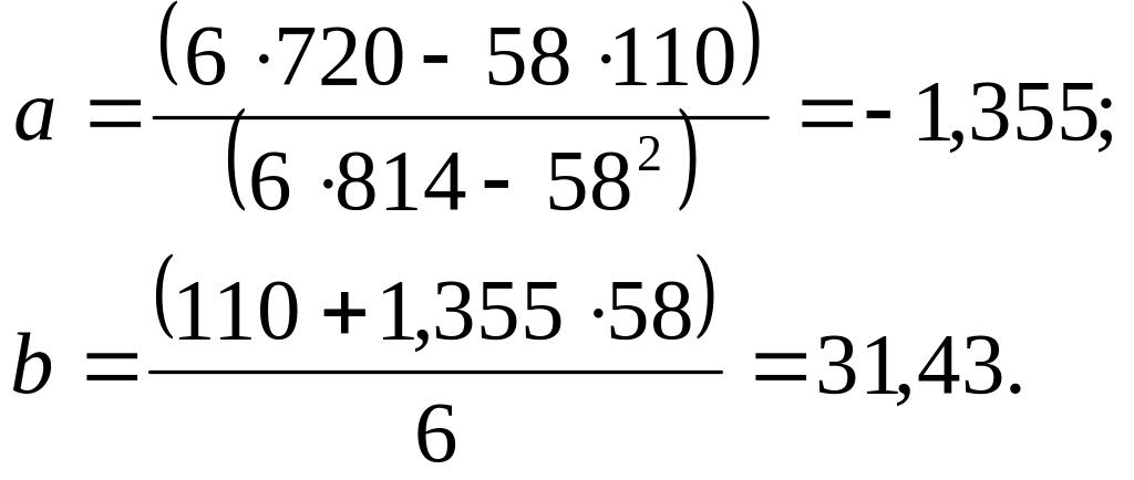 У даному випадку маємо 4738 = 814 + 2-720 + 2484, тобто розрахунки виконано вірно. Отримано рівняння: y = 31,43-1,355x.
