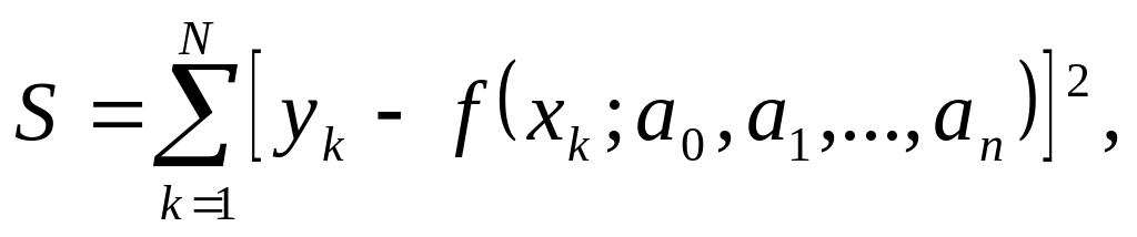 Спосіб найменших квадратів полягає у тому, що якщо всі значення функції у1,у2,…,yn виміряні з однаковою точністю, то оцінки параметрів ао,а1,....ап проводять за умови: сума квадратів відхилень значень ук, що заміряні, від розрахункових fN(хк;ао,а1,...аn), тобто: