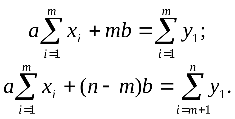 Звичайно, т обирають таким чином, щоб число спостережень у другій групі дорівнювало також т, якщо п парне, та т±1, якщо и непарне. Отриману систему для визначення коефіцієнтів а та b записують у наступному вигляді: