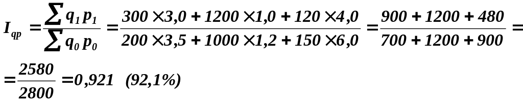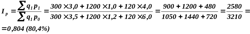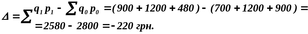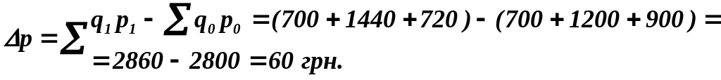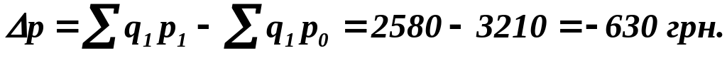 Вывод: Стоимость товаров в ценах базисного периода (q1p0) больше фактической, значит, покупатели заплатили в отчетном году на 630 грн. меньше в связи со снижением цен.