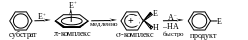 Первой ступенью взаимодействия ароматических соединений с электрофильным агентом Е+ при реакциях электрофильного замещения является образование - комплекса, который медленно, лимитируя скорость всей реакции, перегруппировывается в карбкатион (- комплекс).