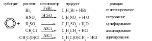 К реакциям электрофильного замещения относятся реакции галогенирования, нитрования, сульфирования, алкилирования, ацилирования: