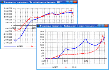 Рис. 46. Графіки порівняння коефіцієнтів ліквідності та оборотного капіталів для варіантів купівлі та лізингу автомобілів