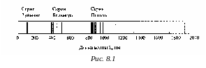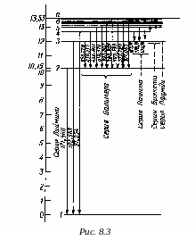 Здесь λ – длина волны излучения, n и k (k<n) – целые числа, а R – постоянная Ридберга (R=1.1.107 м-1). Оказалось, что серия Лаймана (см. рис.8.1) получается при k=1, n=2, 3, 4, …∞; серия Бальмера (она наблюдается в видимой области спектра) – при k=2, n=3, 4, 5, …∞; серия Пашена – при k=3, n=4, 5, 6, …∞ и так далее.