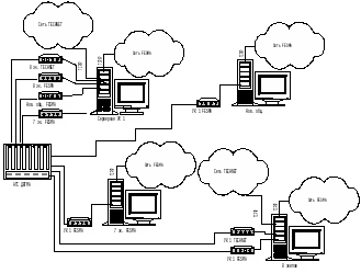 По исследованиям журнала PC Magazine из всех модемов ,которые присутствуют на рынке на данный момент, соотношение цена/производительность самая высокая у модема US Robotics Courier 33.600. Этот модем поддерживает все существующие на сегодняшний день протоколы. Дополнительно в этом модеме присутствует фирменный US Robotics протокол,V2. Если на линии связывается два таких модема, то используя этот протокол возможна скорость до 56,6 кБит/сек. Желательно использование модемов во внешнем исполнении, т.к. при зависании встроенного модема, необходимо перегружать весь компьютер, что останавливает работу сети. При зависании внешнего модема, необходимо перегружать только сам модем. В связи с тем, что модем может работать только с компьютером, необходимо в каждой точке доступа установить компьютер-сервер связи. Для этих целей подойдет компьютер с минимальной конфигурацией, которая предлагается фирмами по продаже компьютеров на данный момент. Т.к. всего 4 точки доступа, то необходимо 4 компьютера. (рис.5)