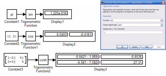 Рис. 7.52. Приклади використання блоку Trigonometric Function та його параметри