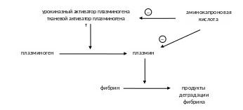 Аминокапроновая кислота а) инактивирует урокиназный и тканевой активаторы плазминогена и б) в меньшей степени способна прямо угнетать активность плазмина (рис. 10). Следовательно, аминокапроновая кислота ингибирует фибринолиз, что смещает равновесие в сторону образования фибрина и свертывания крови.