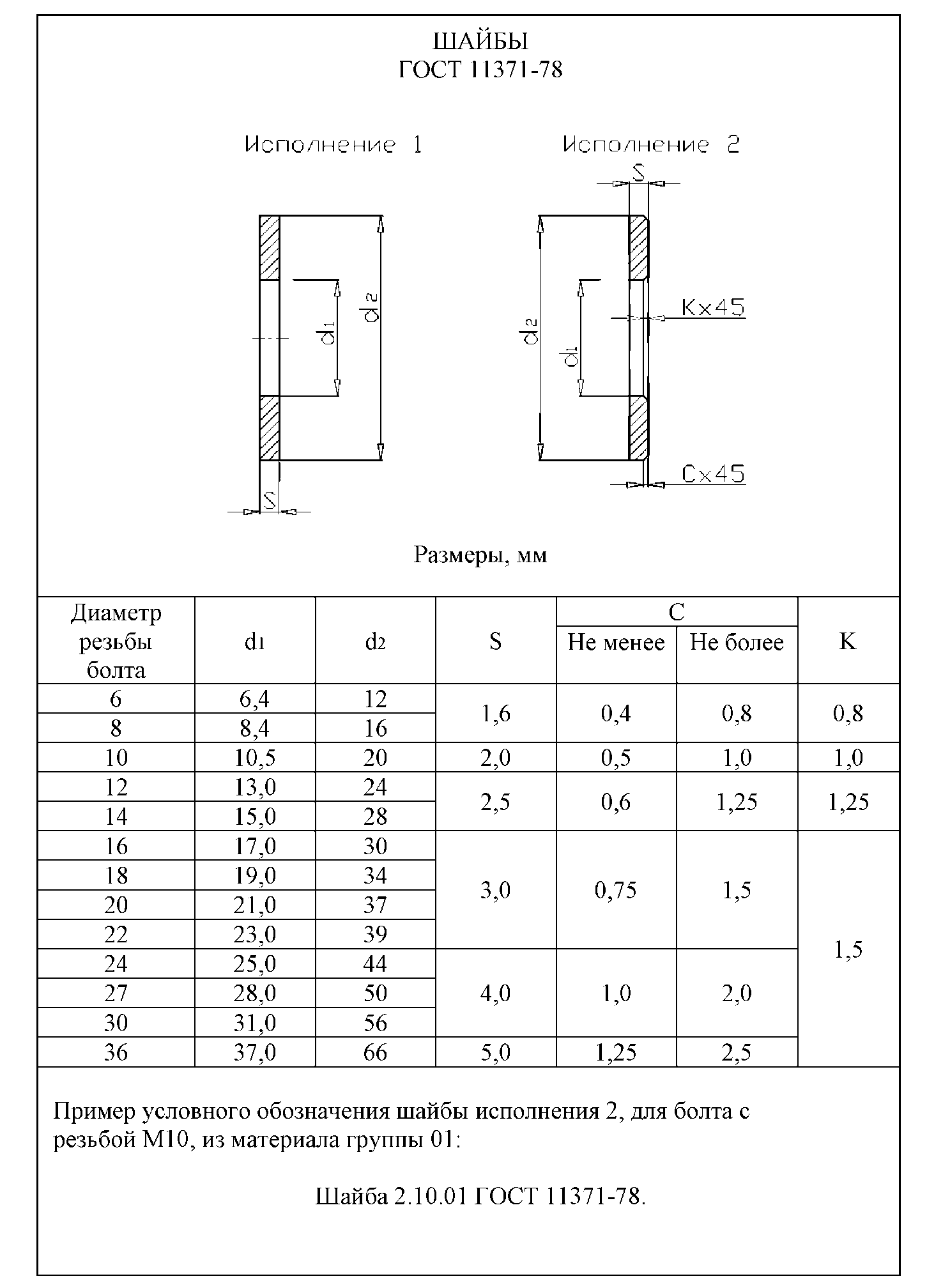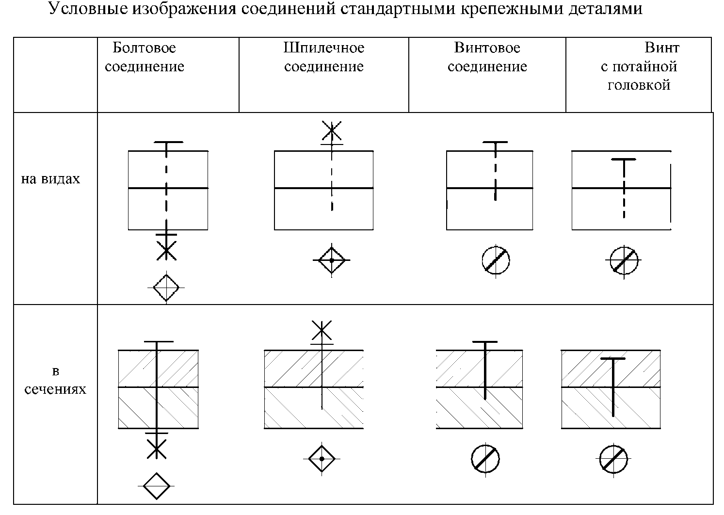 Крепежные детали, у которых диаметры стержней равны или менее 2мм, изображают на чертежах условно. Размер изображения должен давать полное представление о характере соединения. Условные изображения соединений стандартными резьбовыми деталями приведены в таблице 2.