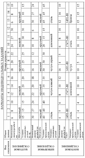 В рабочей тетради вычертить болтовое, шпилечное, винтовое соединения деталей по условным соотношениям. Рядом с резьбовым соединением выполнить его расчет.
