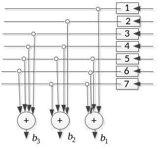 Таким образом, кодовым словом для информационной последовательности 1111 будет 1111111. Или кодирование также можно осуществить умножением информационной последовательности длины на порождающую матрицу G.