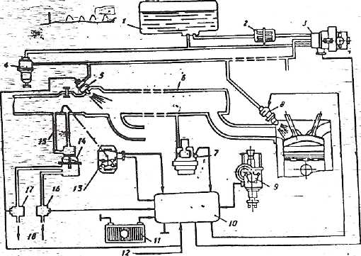 5 – форсунка (пуск и холостой ход), 6 – впускной трубопровод, 7 – датчик давления, 8 – форсунка, 9 – синхронизатор впрыска топлива и прерыватель-распределитель зажигания, 10 – электронный блок управления, 11 – аккумуляторная батарея, 12 – связь со стартером, 13 – выключатель соединенный с воздушной заслонкой, 14 – клапан управления подачей воздуха, 15 – трубопровод подачи дополнительного воздуха, 16 – датчик температуры охлаждающей жидкости, 17 – клапан управления подачей жидкости.