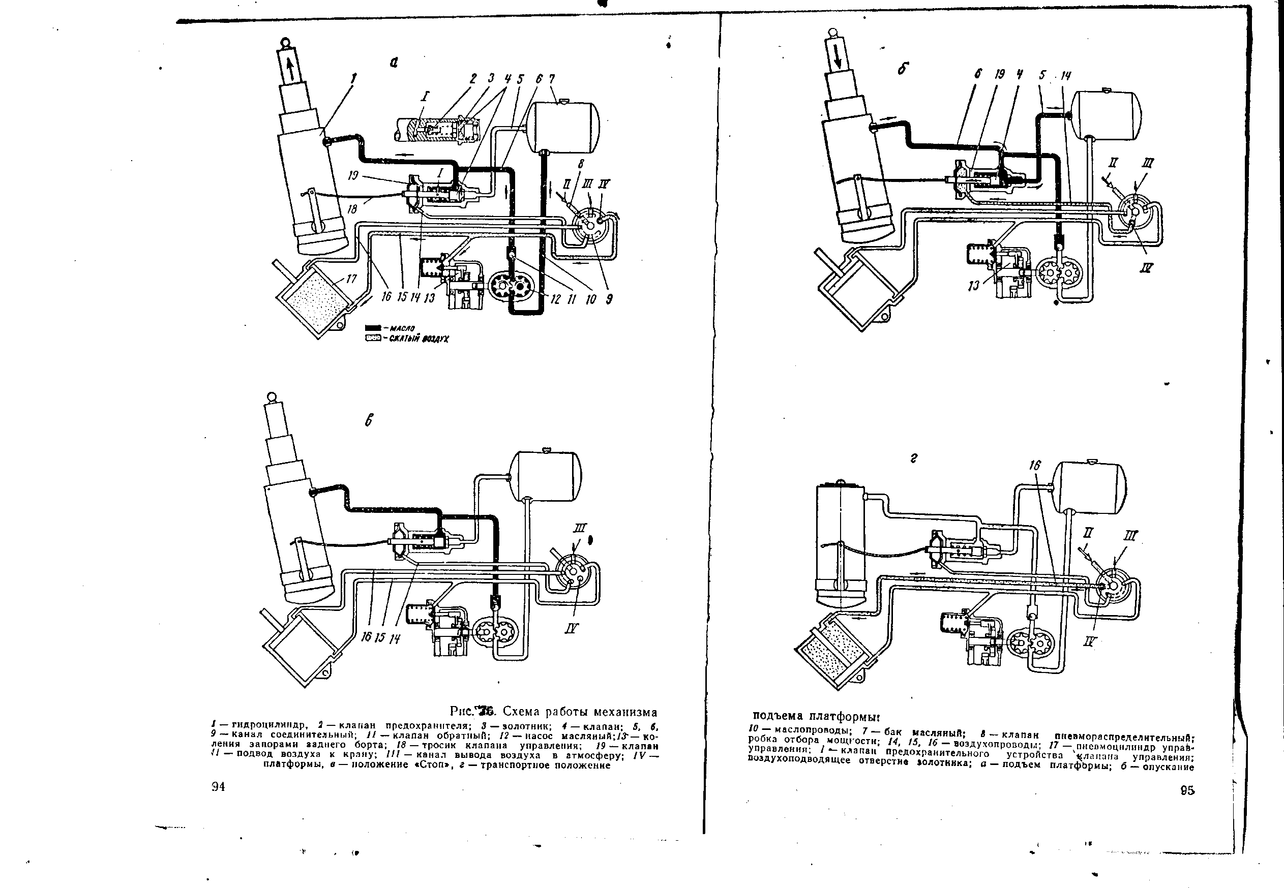 Пневмокамера коробки отбора мощности и обе полости бортового цилиндра 17, соединяются краном с атмосферой. Препуской клапан открывается, насос включ., а поршень бортового цилиндра остается в прежнем положении. Кузов под действием силы тяжести начинает опускаться, вытесняя масло ч/з перепускной клапан и сливной маслопровод в бак 7.