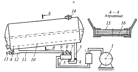 Аэроднище цистерны состоит из нескольких слоев пористой ткани 15, которые размещены над металлической сеткой 16. Через аэроднище сжатый воздух проходит вверх и насыщает нижние слои цемента. Слои цемента перемещаются в разгрузочный патрубок 12, куда также подается сжатый воздух. В разгрузочном патрубке сжатый воздух захватывает цемент и через форсунки 13 поступает с ним в разгрузочный шланг. В трубопроводе 3 и разгрузочном патрубке установлены вентили 4, которые служат для управления процессом разгрузки цистерны.