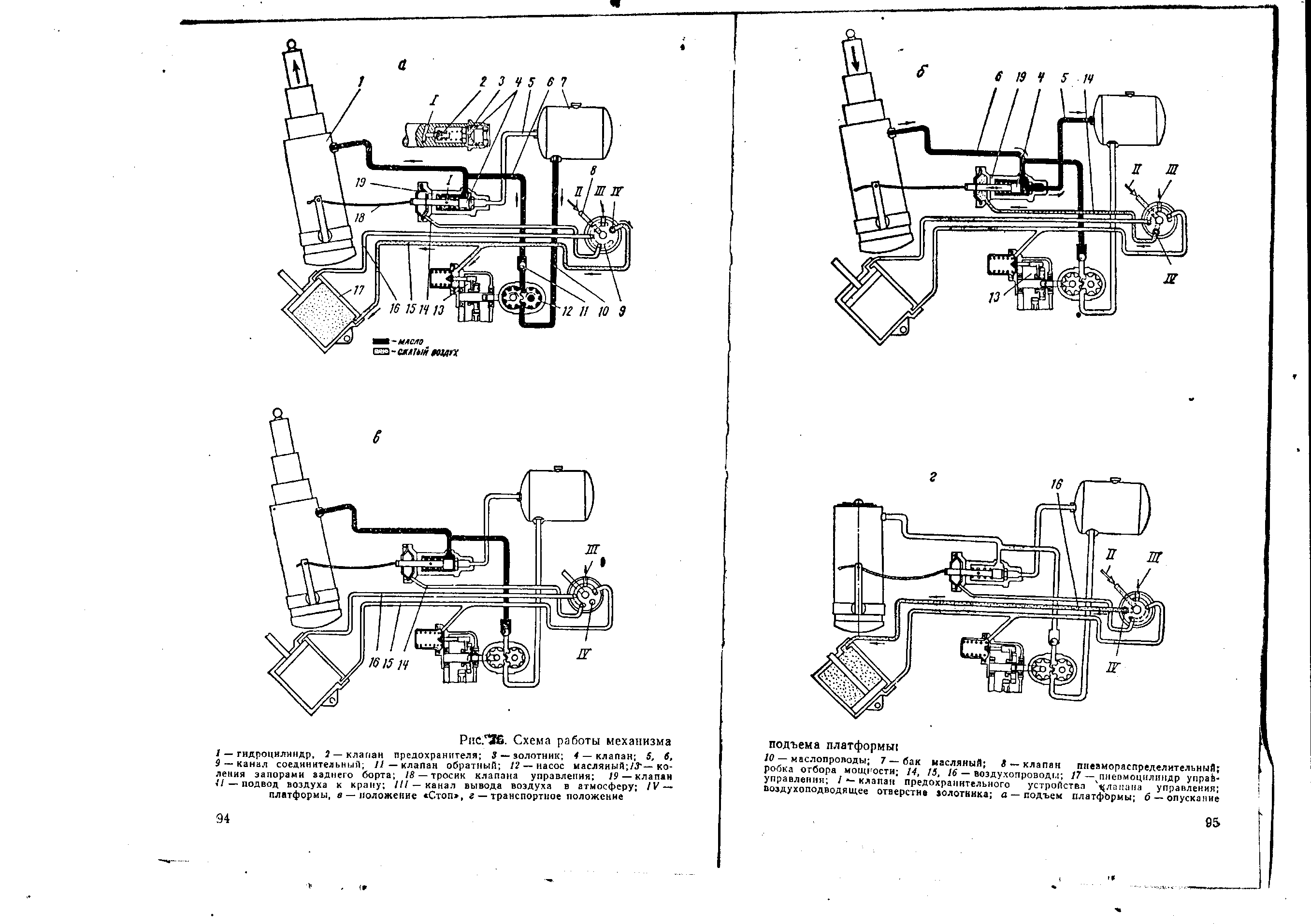 1-гидроцилиндр; 2-клапан предохранения; 3-золотник (а)-положение подъема кузова; (б)-опускание кузова; (в)-положение СТОП; (г)-транспортное положение; 4-клапан; 5,6,10- маслопровода;7- бак масленый; 8- кран пневмораспределительный;9-канал соединительный; 11-клапан обратный;12-насос масленый; 13-коробка отбора мощности; 14,15,16-воздухопроводы;17-пневмоцилиндр управления запорами заднего борта;18-тросик клапана управления;19-клапан управления: I-канал предохранительного устройства клапана управления, II-подвод воздуха к крану, III-канал вывода воздуха в атмосферу, IV-воздухопроводящее отверстие золотника.