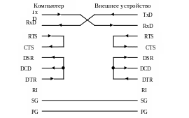 Наиболее часто используются трех- или четырехпроводная связь (для двунаправленной передачи). Схема соединения для четырехпроводной линии связи показана на рис. 2. Для двухпроводной линии связи в случае только передачи из компьютера во внешнее устройство используются сигналы SG и TxD. Все 10 сигналов интерфейса задействуются только при соединении компьютера с модемом.
