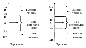 Стандарт RS-232C описывает несимметричные передатчики и приемники – сигнал передается относительно общего провода – схемной земли (симметричные дифференциальные сигналы используются в других интерфейсах, например, RS-422). Интерфейс не обеспечивает гальванической развязки устройств. Логической единице соответствует напряжение на входе приемника в диапазоне -12 … -3В (рис. 1). Логическому нулю соответствует диапазон +3 … +12В. Диапазон -3 … +3В – зона нечувствительности, обусловливающая гистерезис приемника: состояние линии будет считаться измененным только после пересечения порога. Уровни сигналов на выходах передатчиков должны быть в диапазонах -12 … -5В и +5 … +12В для представления единицы и нуля соответственно.