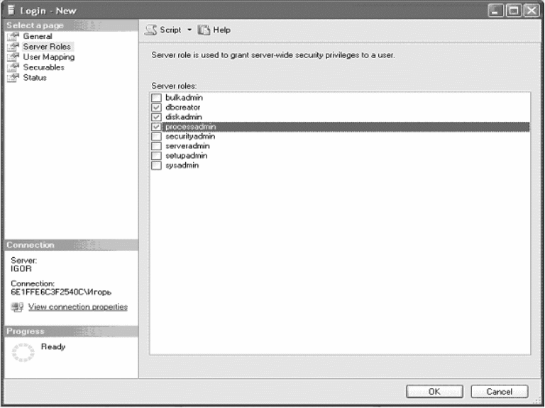 Теперь выделите на левой панели элемент Server Roles, как показано на рис. 6. Здесь вы можете выбрать, какие привилегии безопасности серверной стороны должен иметь данный пользователь.