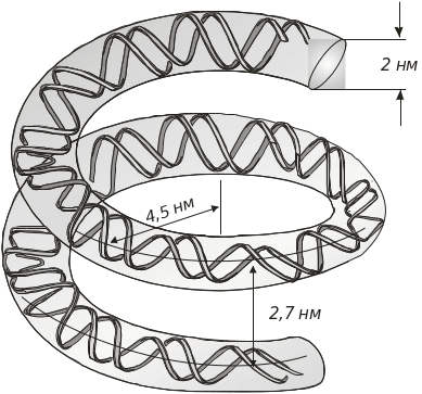 Рис. 5.16. Форма й розміри ДНК, яка обвиває гістоновий октамер. Крок суперспіралі 2,7 нм. На один супервиток припадає 80 пар основ ДНК