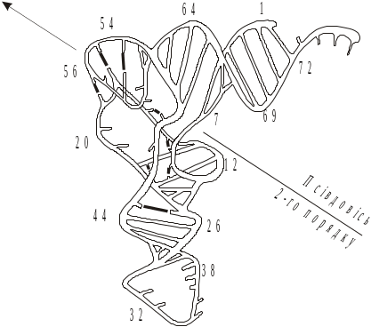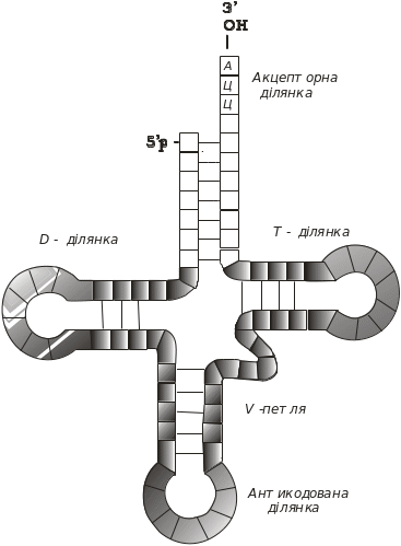 Молекули тРНК являють собою полінуклеотидний ланцюг, що містить від 75 до 90 нуклеотидів. В організмі тРНК виконують дві основні функції: акцепторну й адапторну. Акцепторна функція полягає в тому, що аміноацил-тРНК-синтетаза приєднує амінокислоту до відповідної тРНК. Комплекс тРНК – амінокислота виступає в ролі адаптора (посередника) між мРНК і поліпептидним ланцюгом, що синтезується. тРНК є однією з найбільш вивчених макромолекул. Проведено аналіз первинної структури близько 200 молекул тРНК. Характерною її особливістю є наявність в її складі приблизно 10 % мінорних нуклеотидів. тРНК утворюють вторинну структуру, яка нагадує лист конюшини (рис. 5.13).