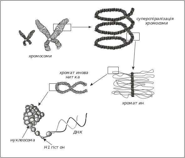 Молекули ДНК в еукаріотів є значно більшими й місятться в кількох хромосомах, які мають складну організацію. У клітинах людини присутні 46 хромосом з ДНК, довжина яких коливається від 4 до 8 см (сумарна довжина хромосомних ДНК людини становить приблизно 2 м). Характерною особливістю еукаріотичної ДНК є високий рівень її компактизації. У клітинах еукаріотів хромосомна ДНК у комплексі з гістонами утворює хроматин (рис. 5.15). Спочатку вважалося, що ДНК у хроматині рівномірно вкрита шаром гістонів, але за допомогою електронної мікроскопії встановлено, що це не відповідає дійсності.