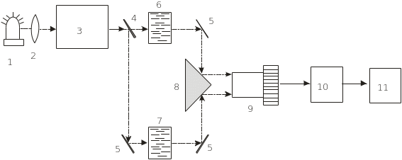 Рис. 4.11. Блок-схема спектрофотометра: 1 – джерело світла; 2 – лінза; 3 – монохроматор; 4 – напівпрозоре дзеркало; 5 – відбиваючі дзеркала; 6 і 7 – кювети з розчином і розчинником, відповідно; 8 – призма; 9 – ФЕП; 10 – підсилювач; 11 – записуючий пристрій