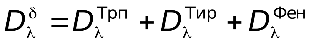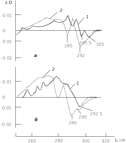 де б293 і б286 – диференційні коефіцієнти молярної екстинції білка на 293 (характерний пік у диференційному спектрі триптофану, рис. 12, б) і 286 нм (для тирозину); Трп і Тир – диференційні коефіцієнти молярної екстинції триптофану й тирозину, які визначаються незалежно в модельних експериментах.