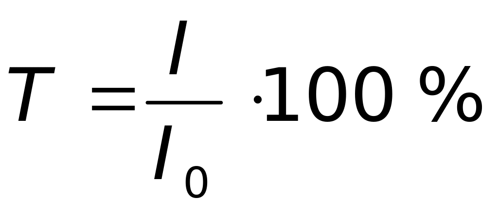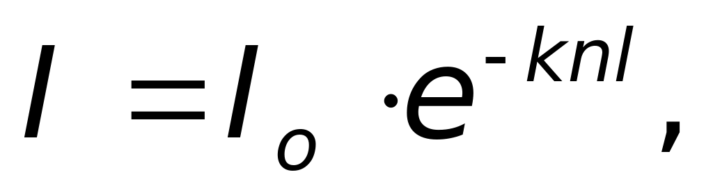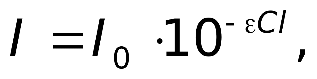де І – інтенсивність світла, яке пройшло через розчин досліджуваної речовини; Іо – інтенсивність світла, яке падає на кювету; n – кількість молекул в одиниці об’єму; k – ефективна площа поперечного розрізу сечение переріз молекули, яка поглинає кванти світла; l – товщина кювети. Частіше використовується запис цього закону через десяткові логарифми: