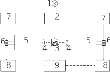 1 – джерело УФ-світла; 2 – монохроматор збудження; 3 – кювета з розчином; 4 – фокусуючі лінзи; 5 – монохроматор флуоресценції; 6 – ФЕП; 7 – високовольтний стабілізатор напруги; 8 – підсилювачі; 9 – комп’ютер; 10 – реєструючий пристрій