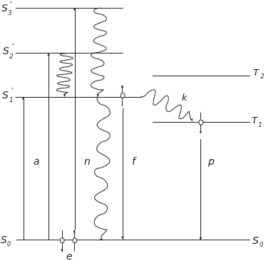 S – синглетні рівні; Т – триплетні рівні; а – поглинання квантів світла; f – флуоресценція; Р – фосфоресценція; n – внутрішня конверсія (безрадіаційні переходи); К – інтеркомбінаційна конверсія; е– електрон